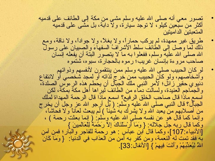 7. 7. ‫تصور معي أنه صلى ال عليه وسلم مشى من مكة إلى الطائف على قدميه‬ ‫•‬ ‫أكثر من سبعين كيلو، ل توجد سيارة، ول دابة، بل مشى على قدميه‬ ‫المتعبتين الداميتين‬ ‫طريق غير ممهدة، لم يركب حمارا، ول بغل، ول جوادا، ول ناقة، ومع‬ ‫ ً‬ ‫ ً‬ ‫ ً‬ ‫•‬ ‫ذلك لما وصل إلى الطائف سلط الشراف السفهاء والصبيا ن على رسول‬ ‫ َ‬ ‫م ُ‬ ‫ال صلى ال عليه وسلم، ففعلوا به ما ل يتصور البتة أ ن يفعله إنسا ن‬ ‫صاحب مروءة بإنسا ن غريب؛ رموه بالحجارة، سبوه، شتموه‬ ‫لو كا ن الحبيب صلى ال عليه وسلم ممن ينتقمو ن لنفسهم وذواتهم‬ ‫•‬‫وأشخاصهم، ولو كا ن الحبيب ممن خرج لذاته أو لمجد شخصي أو لنتفاع‬ ‫دنيوي حقير زائل؛ لمر النبي ملك الجبال أ ن يحطم هذه الرءوس الصلدة،‬ ‫ ٍ‬ ‫والجماجم العنيدة، ولسالت دماء من الطائف ليراها أهل مكة بمكة، لكن‬ ‫اسمع ماذا قال صاحب الخلق الرفيع؟ اسمع ماذا قال الرحمة المهداة لملك‬‫الجبال؟ قال النبي صلى ال عليه وسلم: ) بل أرجو ال عز وجل أ ن يخرج‬ ‫من أصلبهم من يعبد ال ول يشرك به شيئا ( لم يبعث لعانا ول فحاشا،‬ ‫ ً‬ ‫ ً‬ ‫ ً‬ ‫وإنما كما قال هو عن نفسه صلى ال عليه وسلم: ) إنما بعثت رحمة ( ،‬ ‫وكما قال ربه جل جلله: } وما أرسلناك إل رحمة للعالمين {‬ ‫ َ َ َ َرْ َ َرْ َ َ نِ َّ َ َرْ َ ً نِ َرْ َ َ نِ َ‬ ‫]النبياء:701 [، وكما قال ابن عباس : هو رحمة للفاجر والبار؛ فمن آمن‬ ‫ َ َ َ َ‬ ‫به فقد تمت له النعمة، ومن كفر به أمن من العذاب في الدنيا: } وما كا ن‬ ‫ال ليعذبهم وأنت فيهم { ]النفال:33[.‬ ‫َّ نِ م ُ َ يِّ َ م ُ َرْ َ َ َرْ َ نِ نِ َرْ‬ ‫م ُ‬