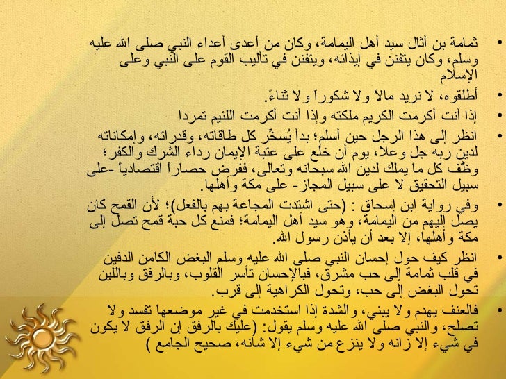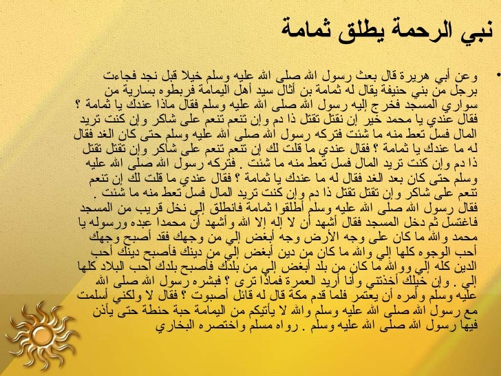 8. 8. ‫نبيلع الرحمةلع يطلقلع ثمامة‬ ‫وعن أبي هريرة قال بعث رسول ال صلى ال عليه وسلم خيل قبل نجد فجاءت‬ ‫•‬ ‫برجل من بني حنيفة يقال له ثمامة بن أثال سيد أهل اليمامة فربطوه بسارية من‬‫سواري المسجد فخرج إليه رسول ال صلى ال عليه وسلم فقال ماذا عندك يا ثمامة ؟‬ ‫فقال عندي يا محمد خير إ ن نقتل تقتل ذا د م وإ ن تنعم تنعم على شاكر وإ ن كنت تريد‬‫المال فسل تعط منه ما شئت فتركه رسول ال صلى ال عليه وسلم حتى كا ن الغد فقال‬ ‫له ما عندك يا ثمامة ؟ فقال عندي ما قلت لك إ ن تنعم تنعم على شاكر وإ ن تقتل تقتل‬ ‫ذا د م وإ ن كنت تريد المال فسل تعط منه ما شئت . فتركه رسول ال صلى ال عليه‬ ‫وسلم حتى كا ن بعد الغد فقال له ما عندك يا ثمامة ؟ فقال عندي ما قلت لك إ ن تنعم‬ ‫تنعم على شاكر وإ ن تقتل تقتل ذا د م وإ ن كنت تريد المال فسل تعط منه ما شئت .‬ ‫فقال رسول ال صلى ال عليه وسلم أطلقوا ثمامة فانطلق إلى نخل قريب من المسجد‬ ‫فاغتسل ثم دخل المسجد فقال أشهد أ ن ل إله إل ال وأشهد أ ن محمدا عبده ورسوله يا‬ ‫محمد وال ما كا ن على وجه الرض وجه أبغض إلي من وجهك فقد أصبح وجهك‬ ‫أحب الوجوه كلها إلي وال ما كا ن من دين أبغض إلي من دينك فأصبح دينك أحب‬ ‫الدين كله إلي ووال ما كا ن من بلد أبغض إلي من بلدك فأصبح بلدك أحب البلد كلها‬ ‫إلي . وإ ن خيلك أخذتني وأنا أريد العمرة فماذا ترى ؟ فبشره رسول ال صلى ال‬ ‫عليه وسلم وأمره أ ن يعتمر فلما قد م مكة قال له قائل أصبوت ؟ فقال ل ولكني أسلمت‬ ‫مع رسول ال صلى ال عليه وسلم وال ل يأتيكم من اليمامة حبة حنطة حتى يأذ ن‬ ‫فيها رسول ال صلى ال عليه وسلم . رواه مسلم واختصره البخاري‬