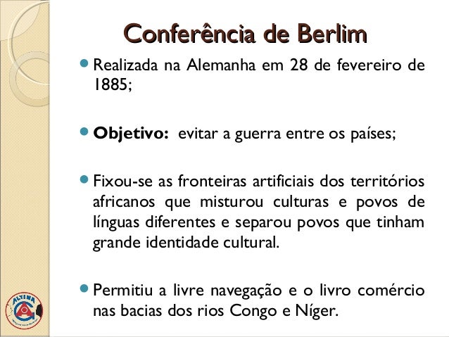 9. 9. Conferência de BerlimRealizada na Alemanha em 28 de fevereiro de 1885;Objetivo: evitar a guerra entre os países;Fixou-se as fronteiras artificiais dos territórios africanos que misturou culturas e povos de línguas diferentes e separou povos que tinham grande identidade cultural.Permitiu a livre navegação e o livro comércio nas bacias dos rios Congo e Níger.