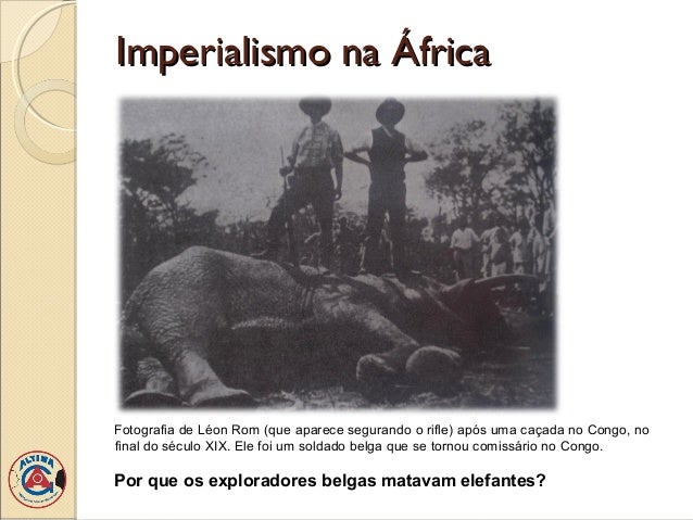 11. 11. Imperialismo na ÁfricaFotografia de Léon Rom (que aparece segurando o rifle) após uma caçada no Congo, nofinal do século XIX. Ele foi um soldado belga que se tornou comissário no Congo.Por que os exploradores belgas matavam elefantes?