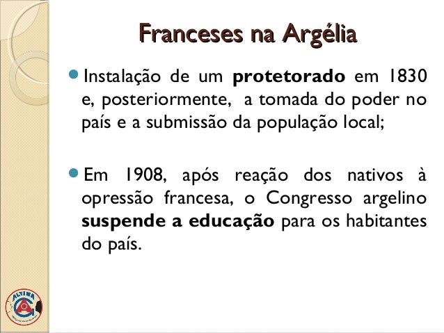 16. 16. Franceses na ArgéliaInstalação de um protetorado em 1830 e, posteriormente, a tomada do poder no país e a submissão da população local;Em 1908, após reação dos nativos à opressão francesa, o Congresso argelino suspende a educação para os habitantes do país.