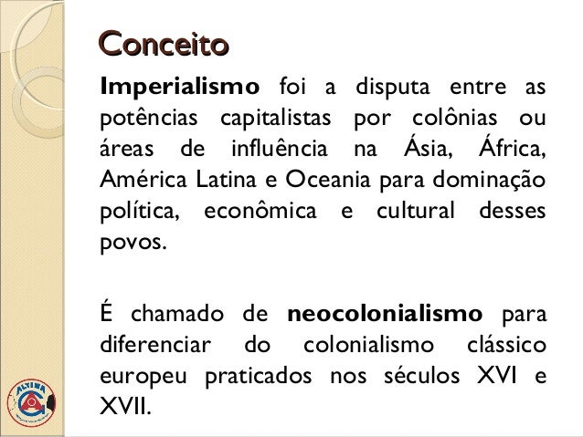 2. 2. ConceitoImperialismo foi a disputa entre aspotências capitalistas por colônias ouáreas de influência na Ásia, África,América Latina e Oceania para dominaçãopolítica, econômica e cultural dessespovos.É chamado de neocolonialismo paradiferenciar do colonialismo clássicoeuropeu praticados nos séculos XVI eXVII.