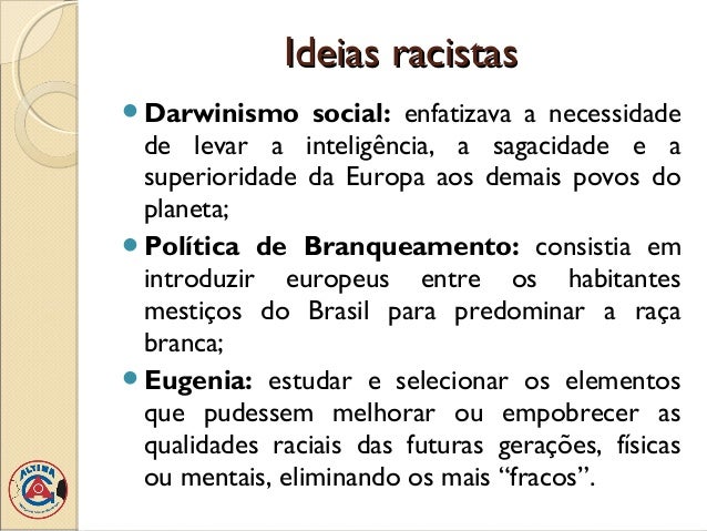 6. 6. Ideias racistasDarwinismo social: enfatizava a necessidade de levar a inteligência, a sagacidade e a superioridade da Europa aos demais povos do planeta;Política de Branqueamento: consistia em introduzir europeus entre os habitantes mestiços do Brasil para predominar a raça branca;Eugenia: estudar e selecionar os elementos que pudessem melhorar ou empobrecer as qualidades raciais das futuras gerações, físicas ou mentais, eliminando os mais “fracos”.