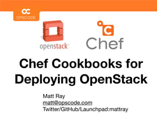 Presentation from the Spring 2011 OpenStack Design Summit. Blueprint URL is https://blueprints.launchpad.net/openstack-devel/+spec/openstack-deployment-cookbooks