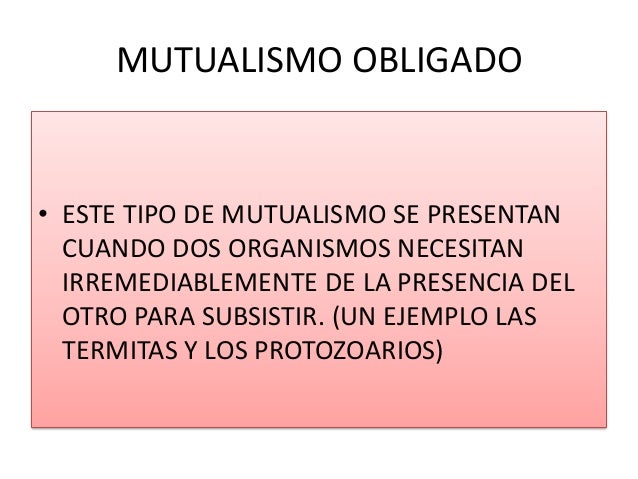 MUTUALISMO OBLIGADO• ESTE TIPO DE MUTUALISMO SE PRESENTAN  CUANDO DOS ORGANISMOS NECESITAN  IRREMEDIABLEMENTE DE LA PRESEN...