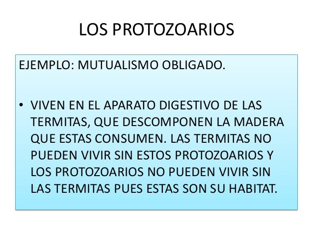 LOS PROTOZOARIOSEJEMPLO: MUTUALISMO OBLIGADO.• VIVEN EN EL APARATO DIGESTIVO DE LAS  TERMITAS, QUE DESCOMPONEN LA MADERA  ...