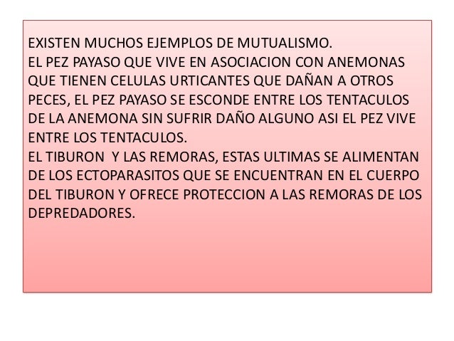 6. 6. EXISTEN MUCHOS EJEMPLOS DE MUTUALISMO.EL PEZ PAYASO QUE VIVE EN ASOCIACION CON ANEMONASQUE TIENEN CELULAS URTICANTES QUE DAÑAN A OTROSPECES, EL PEZ PAYASO SE ESCONDE ENTRE LOS TENTACULOSDE LA ANEMONA SIN SUFRIR DAÑO ALGUNO ASI EL PEZ VIVEENTRE LOS TENTACULOS.EL TIBURON Y LAS REMORAS, ESTAS ULTIMAS SE ALIMENTANDE LOS ECTOPARASITOS QUE SE ENCUENTRAN EN EL CUERPODEL TIBURON Y OFRECE PROTECCION A LAS REMORAS DE LOSDEPREDADORES.