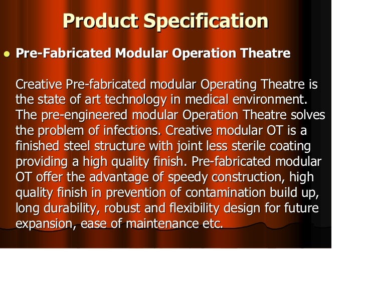 12. 12. Product SpecificationPre-Fabricated Modular Operation TheatreCreative Pre-fabricated modular Operating Theatre isthe state of art technology in medical environment.The pre-engineered modular Operation Theatre solvesthe problem of infections. Creative modular OT is afinished steel structure with joint less sterile coatingproviding a high quality finish. Pre-fabricated modularOT offer the advantage of speedy construction, highquality finish in prevention of contamination build up,long durability, robust and flexibility design for futureexpansion, ease of maintenance etc.