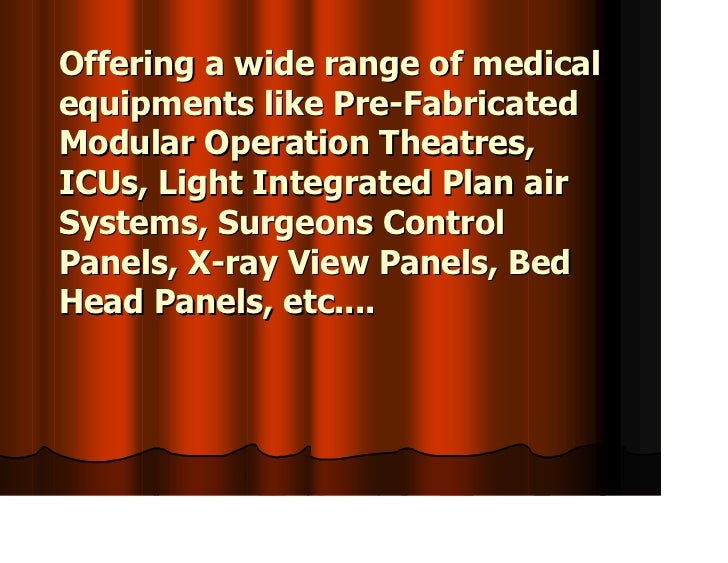 1. 1. Offering a wide range of medicalequipments like Pre-FabricatedModular Operation Theatres,ICUs, Light Integrated Plan airSystems, Surgeons ControlPanels, X-ray View Panels, BedHead Panels, etc....