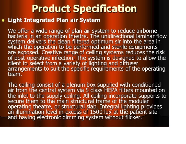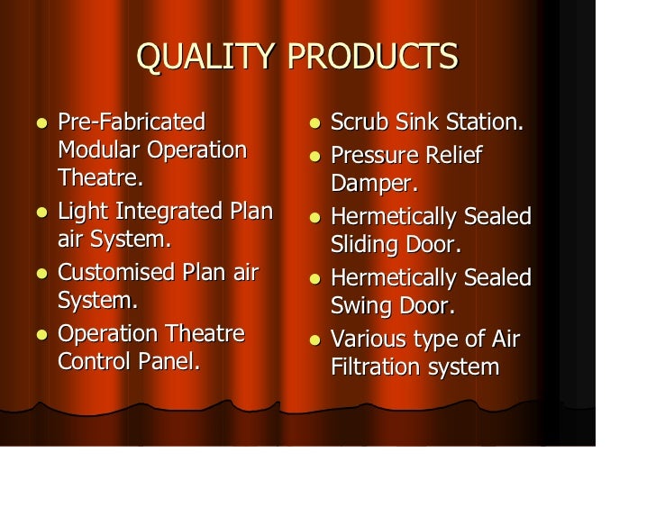 8. 8. QUALITY PRODUCTSPre-Fabricated Scrub Sink Station.Modular Operation Pressure ReliefTheatre. Damper.Light Integrated Plan Hermetically Sealedair System. Sliding Door.Customised Plan air Hermetically SealedSystem. Swing Door.Operation Theatre Various type of AirControl Panel. Filtration system