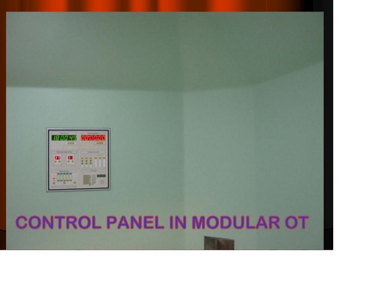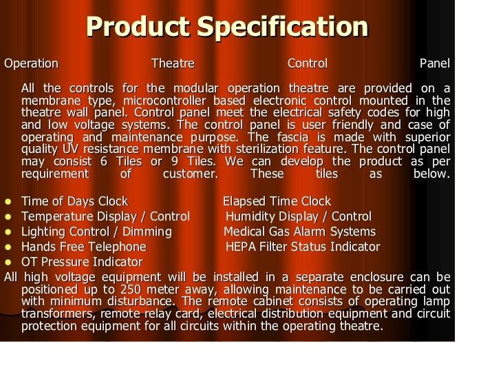 18. 18. Product SpecificationOperation Theatre Control Panel All the controls for the modular operation theatre are provided on a membrane type, microcontroller based electronic control mounted in the theatre wall panel. Control panel meet the electrical safety codes for high and low voltage systems. The control panel is user friendly and case of operating and maintenance purpose. The fascia is made with superior quality UV resistance membrane with sterilization feature. The control panel may consist 6 Tiles or 9 Tiles. We can develop the product as per requirement of customer. These tiles as below. Time of Days Clock Elapsed Time Clock Temperature Display / Control Humidity Display / Control Lighting Control / Dimming Medical Gas Alarm Systems Hands Free Telephone HEPA Filter Status Indicator OT Pressure IndicatorAll high voltage equipment will be installed in a separate enclosure can be positioned up to 250 meter away, allowing maintenance to be carried out with minimum disturbance. The remote cabinet consists of operating lamp transformers, remote relay card, electrical distribution equipment and circuit protection equipment for all circuits within the operating theatre.