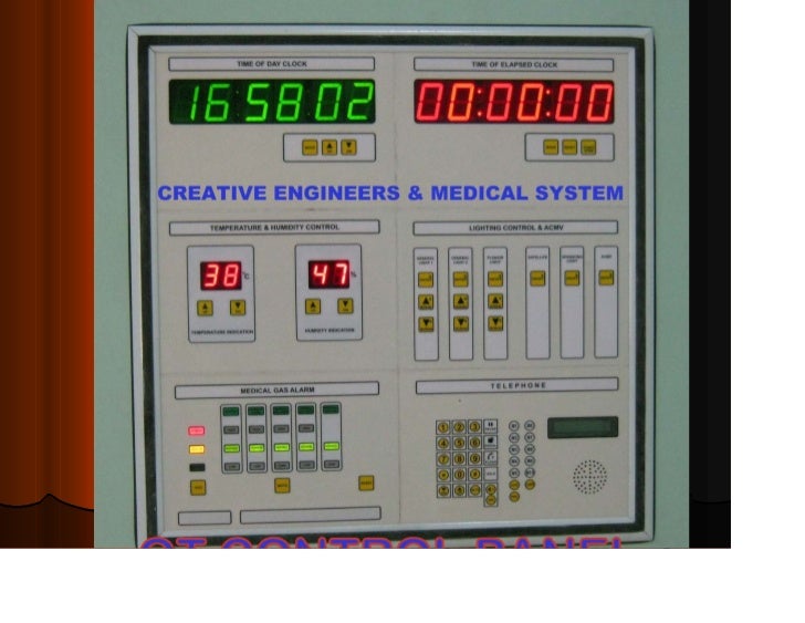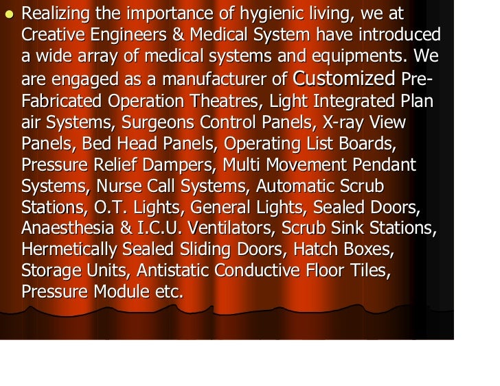 5. 5. Realizing the importance of hygienic living, we atCreative Engineers & Medical System have introduceda wide array of medical systems and equipments. Weare engaged as a manufacturer of Customized Pre-Fabricated Operation Theatres, Light Integrated Planair Systems, Surgeons Control Panels, X-ray ViewPanels, Bed Head Panels, Operating List Boards,Pressure Relief Dampers, Multi Movement PendantSystems, Nurse Call Systems, Automatic ScrubStations, O.T. Lights, General Lights, Sealed Doors,Anaesthesia & I.C.U. Ventilators, Scrub Sink Stations,Hermetically Sealed Sliding Doors, Hatch Boxes,Storage Units, Antistatic Conductive Floor Tiles,Pressure Module etc.
