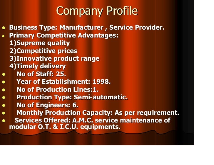 2. 2. Company Profile Business Type: Manufacturer , Service Provider.● Primary Competitive Advantages: 1)Supreme quality 2)Competitive prices 3)Innovative product range 4)Timely delivery No of Staff: 25. Year of Establishment: 1998. No of Production Lines:1. Production Type: Semi-automatic. No of Engineers: 6. Monthly Production Capacity: As per requirement. Services Offered: A.M.C. service maintenance of modular O.T. & I.C.U. equipments.