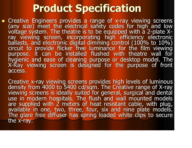 22. 22. Product SpecificationCreative Engineers provides a range of x-ray viewing screens(any size) meet the electrical safety codes for high and lowvoltage system. The theatre is to be equipped with a 2-plate X-ray viewing screen, incorporating high efficiency electronicballasts, and electronic digital dimming control (100% to 10%)circuit to provide flicker free luminance for the film viewingpurpose. it can be installed flushed with theatre wall forhygienic and ease of cleaning purpose or desktop model. TheX-Ray viewing screen is designed for the purpose of frontaccess.Creative x-ray viewing screens provides high levels of luminousdensity from 4000 to 5400 cd/sqm. The Creative range of X-rayviewing screens is ideally suited for general, surgical and dentaluse in modern hospitals. The flush and wall mounted modelsare supplied with 2 meters of heat resistant cable, with plug,available in one, two, three, four, six and nine plate models.The glare free diffuser has spring loaded white clips to securethe x-ray.