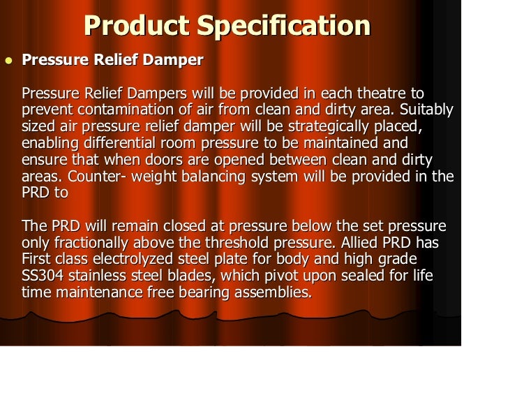 26. 26. Product SpecificationPressure Relief DamperPressure Relief Dampers will be provided in each theatre toprevent contamination of air from clean and dirty area. Suitablysized air pressure relief damper will be strategically placed,enabling differential room pressure to be maintained andensure that when doors are opened between clean and dirtyareas. Counter- weight balancing system will be provided in thePRD toThe PRD will remain closed at pressure below the set pressureonly fractionally above the threshold pressure. Allied PRD hasFirst class electrolyzed steel plate for body and high gradeSS304 stainless steel blades, which pivot upon sealed for lifetime maintenance free bearing assemblies.
