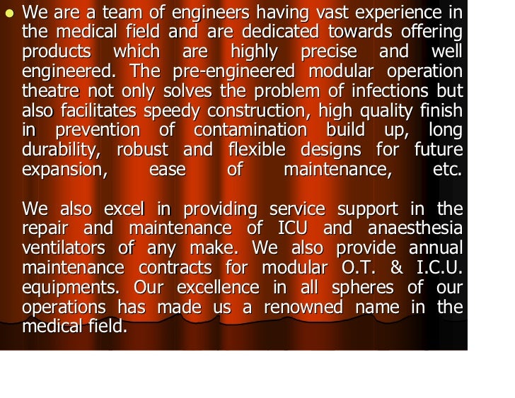 3. 3. We are a team of engineers having vast experience inthe medical field and are dedicated towards offeringproducts which are highly precise and wellengineered. The pre-engineered modular operationtheatre not only solves the problem of infections butalso facilitates speedy construction, high quality finishin prevention of contamination build up, longdurability, robust and flexible designs for futureexpansion, ease of maintenance, etc.We also excel in providing service support in therepair and maintenance of ICU and anaesthesiaventilators of any make. We also provide annualmaintenance contracts for modular O.T. & I.C.U.equipments. Our excellence in all spheres of ouroperations has made us a renowned name in themedical field.