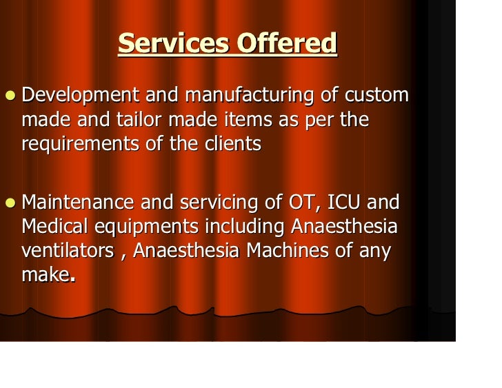 4. 4. Services OfferedDevelopment and manufacturing of custommade and tailor made items as per therequirements of the clientsMaintenance and servicing of OT, ICU andMedical equipments including Anaesthesiaventilators , Anaesthesia Machines of anymake.