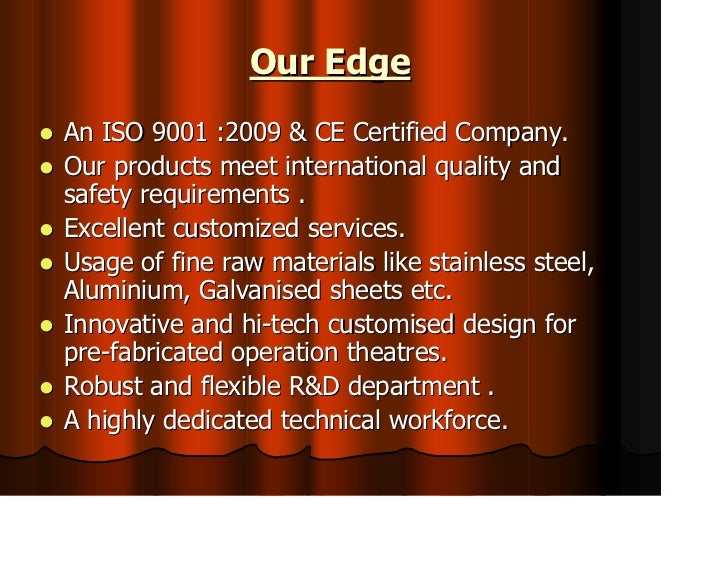 7. 7. Our EdgeAn ISO 9001 :2009 & CE Certified Company.Our products meet international quality andsafety requirements .Excellent customized services.Usage of fine raw materials like stainless steel,Aluminium, Galvanised sheets etc.Innovative and hi-tech customised design forpre-fabricated operation theatres.Robust and flexible R&D department .A highly dedicated technical workforce.