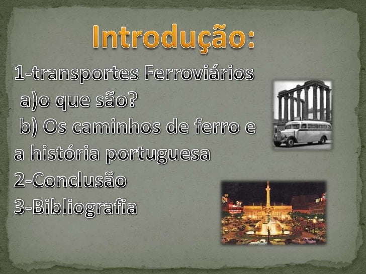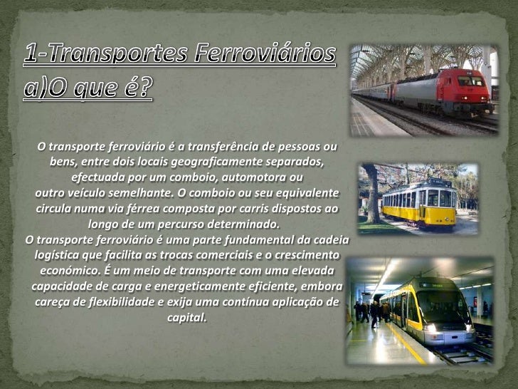 1. 1. O transporte ferroviário é a transferência de pessoas ou bens, entre dois locais geograficamente separados, efectuada por um comboio, automotora ou outro veículo semelhante. O comboio ou seu equivalente circula numa via férrea composta por carris dispostos ao longo de um percurso determinado.O transporte ferroviário é uma parte fundamental da cadeia logística que facilita as trocas comerciais e o crescimento económico. É um meio de transporte com uma elevada capacidade de carga e energeticamente eficiente, embora careça de flexibilidade e exija uma contínua aplicação de capital.