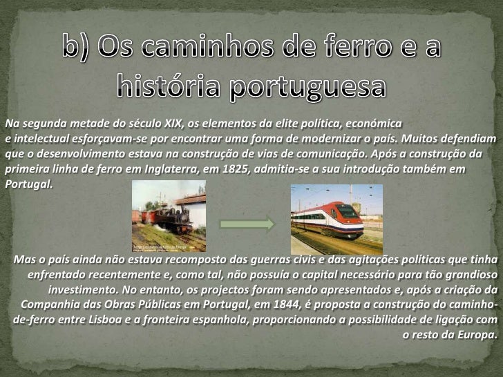 2. 2. Na segunda metade do século XIX, os elementos da elite política, económicae intelectual esforçavam-se por encontrar uma forma de modernizar o país. Muitos defendiamque o desenvolvimento estava na construção de vias de comunicação. Após a construção daprimeira linha de ferro em Inglaterra, em 1825, admitia-se a sua introdução também emPortugal. Mas o país ainda não estava recomposto das guerras civis e das agitações políticas que tinha enfrentado recentemente e, como tal, não possuía o capital necessário para tão grandioso investimento. No entanto, os projectos foram sendo apresentados e, após a criação da Companhia das Obras Públicas em Portugal, em 1844, é proposta a construção do caminho- de-ferro entre Lisboa e a fronteira espanhola, proporcionando a possibilidade de ligação com o resto da Europa.