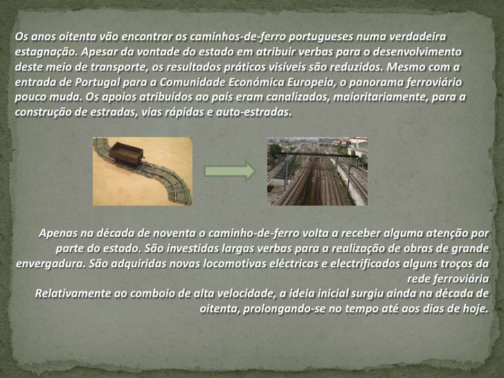 3. 3. Os anos oitenta vão encontrar os caminhos-de-ferro portugueses numa verdadeiraestagnação. Apesar da vontade do estado em atribuir verbas para o desenvolvimentodeste meio de transporte, os resultados práticos visíveis são reduzidos. Mesmo com aentrada de Portugal para a Comunidade Económica Europeia, o panorama ferroviáriopouco muda. Os apoios atribuídos ao país eram canalizados, maioritariamente, para aconstrução de estradas, vias rápidas e auto-estradas. Apenas na década de noventa o caminho-de-ferro volta a receber alguma atenção por parte do estado. São investidas largas verbas para a realização de obras de grandeenvergadura. São adquiridas novas locomotivas eléctricas e electrificados alguns troços da rede ferroviária Relativamente ao comboio de alta velocidade, a ideia inicial surgiu ainda na década de oitenta, prolongando-se no tempo até aos dias de hoje.