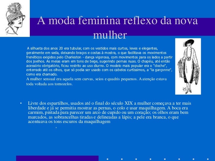 4. 4. A moda feminina reflexo da nova mulher A silhueta dos anos 20 era tubular, com os vestidos mais curtos, leves e elegantes, geralmente em seda, deixando braços e costas à mostra, o que facilitava os movimentos frenéticos exigidos pelo Charleston - dança vigorosa, com movimentos para os lados a partir dos joelhos. As meias eram em tons de bege, sugerindo pernas nuas. O chapéu, até então acessório obrigatório, ficou restrito ao uso diurno. O modelo mais popular era o "cloche", enterrado até os olhos, que só podia ser usado com os cabelos curtíssimos, a "la garçonne", como era chamado. A mulher sensual era aquela sem curvas, seios e quadris pequenos. A atenção estava toda voltada aos tornozelos.• Livre dos espartilhos, usados até o final do século XIX a mulher começava a ter mais liberdade e já se permitia mostrar as pernas, o colo e usar maquilhagem. A boca era carmim, pintada para parecer um arco de cupido ou um coração; os olhos eram bem marcados, as sobrancelhas tiradas e delineadas a lápis; a pele era branca, o que acentuava os tons escuros da maquilhagem ,