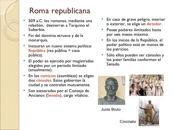 10. 10. Roma republicana <ul><li>509 a.C. los romanos, mediante una rebelión, destierran a Tarquino el Soberbio. </li></ul><ul><li>Fin del dominio etrusco y de la monarquía. </li></ul><ul><li>Instauran un nuevo sistema político: República (res pública = cosa pública). </li></ul><ul><li>El poder es ejercido por magistrados elegidos por un período limitado (anualmente). </li></ul><ul><li>En los comicios (asambleas) se eligen dos cónsules . Estos gobiernan la ciudad y se controlan mutuamente. </li></ul><ul><li>Son asesorados por el Consejo de Ancianos ( Senado ), cargo vitalicio. </li></ul><ul><li>En caso de grave peligro, interior o exterior, se elige un dictador . </li></ul><ul><li>Posee poderes ilimitados hasta por seis meses máximo. </li></ul><ul><li>En los inicios de la República, el poder político está en manos de los patricios. </li></ul><ul><li>Sólo ellos pueden ser cónsules y los pater familias conforman el Senado. </li></ul>Cincinato Junio Bruto
