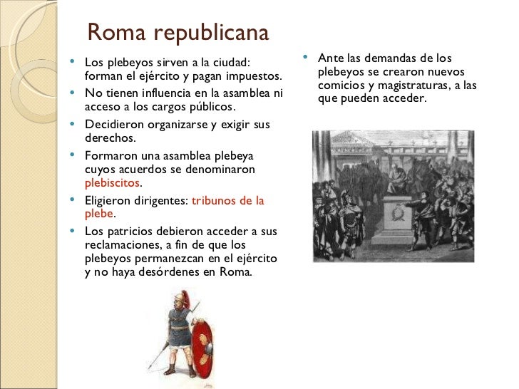 11. 11. Roma republicana <ul><li>Los plebeyos sirven a la ciudad: forman el ejército y pagan impuestos. </li></ul><ul><li>No tienen influencia en la asamblea ni acceso a los cargos públicos. </li></ul><ul><li>Decidieron organizarse y exigir sus derechos. </li></ul><ul><li>Formaron una asamblea plebeya cuyos acuerdos se denominaron plebiscitos . </li></ul><ul><li>Eligieron dirigentes: tribunos de la plebe . </li></ul><ul><li>Los patricios debieron acceder a sus reclamaciones, a fin de que los plebeyos permanezcan en el ejército y no haya desórdenes en Roma. </li></ul><ul><li>Ante las demandas de los plebeyos se crearon nuevos comicios y magistraturas, a las que pueden acceder. </li></ul>