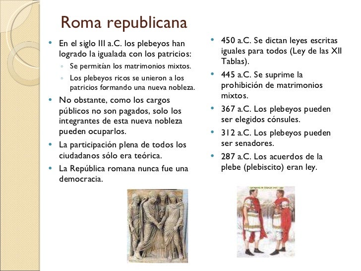 12. 12. Roma republicana <ul><li>En el siglo III a.C. los plebeyos han logrado la igualada con los patricios: </li></ul><ul><ul><li>Se permitían los matrimonios mixtos. </li></ul></ul><ul><ul><li>Los plebeyos ricos se unieron a los patricios formando una nueva nobleza. </li></ul></ul><ul><li>No obstante, como los cargos públicos no son pagados, solo los integrantes de esta nueva nobleza pueden ocuparlos. </li></ul><ul><li>La participación plena de todos los ciudadanos sólo era teórica. </li></ul><ul><li>La República romana nunca fue una democracia. </li></ul><ul><li>450 a.C. Se dictan leyes escritas iguales para todos (Ley de las XII Tablas). </li></ul><ul><li>445 a.C. Se suprime la prohibición de matrimonios mixtos. </li></ul><ul><li>367 a.C. Los plebeyos pueden ser elegidos cónsules. </li></ul><ul><li>312 a.C. Los plebeyos pueden ser senadores. </li></ul><ul><li>287 a.C. Los acuerdos de la plebe (plebiscito) eran ley. </li></ul>