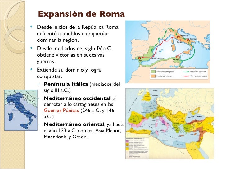 14. 14. Expansión de Roma <ul><li>Desde inicios de la República Roma enfrentó a pueblos que querían dominar la región. </li></ul><ul><li>Desde mediados del siglo IV a.C. obtiene victorias en sucesivas guerras. </li></ul><ul><li>Extiende su dominio y logra conquistar: </li></ul><ul><ul><li>Península Itálica (mediados del siglo III a.C.) </li></ul></ul><ul><ul><li>Mediterráneo occidental , al derrotar a lo cartagineses en las Guerras Púnicas (246 a-C. y 146 a.C.) </li></ul></ul><ul><ul><li>Mediterráneo oriental , ya hacia el año 133 a.C. domina Asia Menor, Macedonia y Grecia. </li></ul></ul>