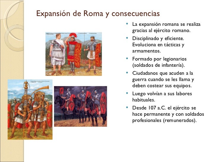 15. 15. Expansión de Roma y consecuencias <ul><li>La expansión romana se realiza gracias al ejército romano. </li></ul><ul><li>Disciplinado y eficiente. Evoluciona en tácticas y armamentos. </li></ul><ul><li>Formado por legionarios (soldados de infantería). </li></ul><ul><li>Ciudadanos que acuden a la guerra cuando se les llama y deben costear sus equipos. </li></ul><ul><li>Luego volvían a sus labores habituales. </li></ul><ul><li>Desde 107 a.C. el ejército se hace permanente y con soldados profesionales (remunerados). </li></ul>