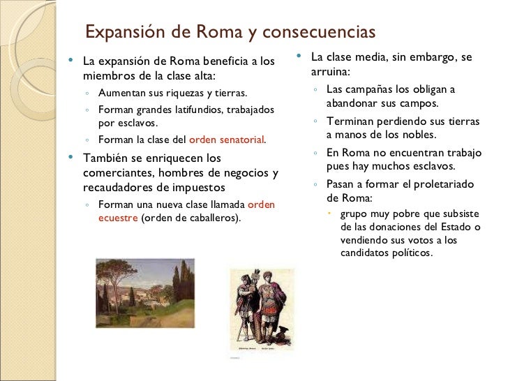 16. 16. Expansión de Roma y consecuencias <ul><li>La expansión de Roma beneficia a los miembros de la clase alta: </li></ul><ul><ul><li>Aumentan sus riquezas y tierras. </li></ul></ul><ul><ul><li>Forman grandes latifundios, trabajados por esclavos. </li></ul></ul><ul><ul><li>Forman la clase del orden senatorial . </li></ul></ul><ul><li>También se enriquecen los comerciantes, hombres de negocios y recaudadores de impuestos </li></ul><ul><ul><li>Forman una nueva clase llamada orden ecuestre (orden de caballeros). </li></ul></ul><ul><li>La clase media, sin embargo, se arruina: </li></ul><ul><ul><li>Las campañas los obligan a abandonar sus campos. </li></ul></ul><ul><ul><li>Terminan perdiendo sus tierras a manos de los nobles. </li></ul></ul><ul><ul><li>En Roma no encuentran trabajo pues hay muchos esclavos. </li></ul></ul><ul><ul><li>Pasan a formar el proletariado de Roma: </li></ul></ul><ul><ul><ul><li>grupo muy pobre que subsiste de las donaciones del Estado o vendiendo sus votos a los candidatos políticos. </li></ul></ul></ul>