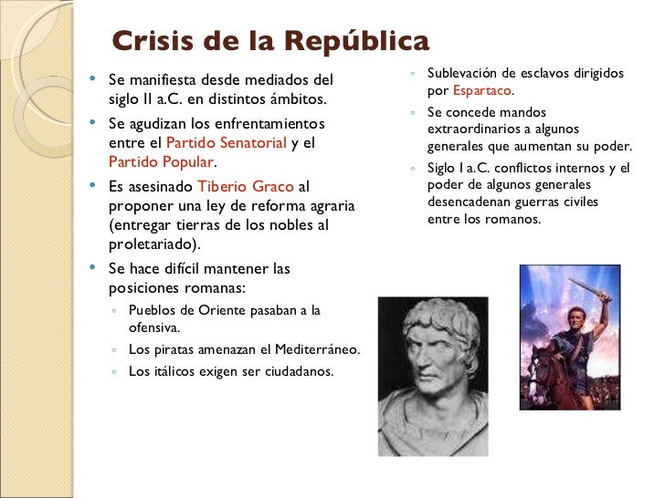 17. 17. Crisis de la República <ul><li>Se manifiesta desde mediados del siglo II a.C. en distintos ámbitos. </li></ul><ul><li>Se agudizan los enfrentamientos entre el Partido Senatorial y el Partido Popular . </li></ul><ul><li>Es asesinado Tiberio Graco al proponer una ley de reforma agraria (entregar tierras de los nobles al proletariado). </li></ul><ul><li>Se hace difícil mantener las posiciones romanas: </li></ul><ul><ul><li>Pueblos de Oriente pasaban a la ofensiva. </li></ul></ul><ul><ul><li>Los piratas amenazan el Mediterráneo. </li></ul></ul><ul><ul><li>Los itálicos exigen ser ciudadanos. </li></ul></ul><ul><ul><li>Sublevación de esclavos dirigidos por Espartaco . </li></ul></ul><ul><ul><li>Se concede mandos extraordinarios a algunos generales que aumentan su poder. </li></ul></ul><ul><ul><li>Siglo I a.C. conflictos internos y el poder de algunos generales desencadenan guerras civiles entre los romanos. </li></ul></ul>