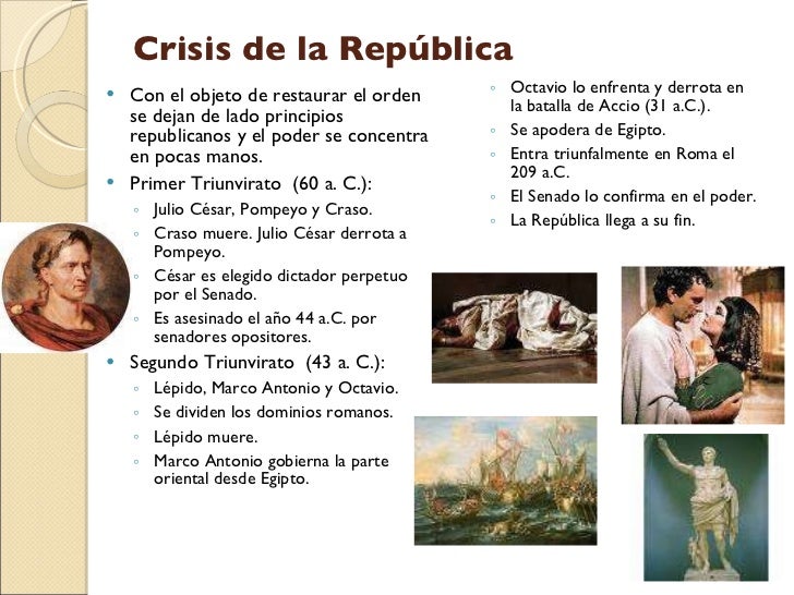 18. 18. Crisis de la República <ul><li>Con el objeto de restaurar el orden se dejan de lado principios republicanos y el poder se concentra en pocas manos. </li></ul><ul><li>Primer Triunvirato (60 a. C.): </li></ul><ul><ul><li>Julio César, Pompeyo y Craso. </li></ul></ul><ul><ul><li>Craso muere. Julio César derrota a Pompeyo. </li></ul></ul><ul><ul><li>César es elegido dictador perpetuo por el Senado. </li></ul></ul><ul><ul><li>Es asesinado el año 44 a.C. por senadores opositores. </li></ul></ul><ul><li>Segundo Triunvirato (43 a. C.): </li></ul><ul><ul><li>Lépido, Marco Antonio y Octavio. </li></ul></ul><ul><ul><li>Se dividen los dominios romanos. </li></ul></ul><ul><ul><li>Lépido muere. </li></ul></ul><ul><ul><li>Marco Antonio gobierna la parte oriental desde Egipto. </li></ul></ul><ul><ul><li>Octavio lo enfrenta y derrota en la batalla de Accio (31 a.C.). </li></ul></ul><ul><ul><li>Se apodera de Egipto. </li></ul></ul><ul><ul><li>Entra triunfalmente en Roma el 209 a.C. </li></ul></ul><ul><ul><li>El Senado lo confirma en el poder. </li></ul></ul><ul><ul><li>La República llega a su fin. </li></ul></ul>