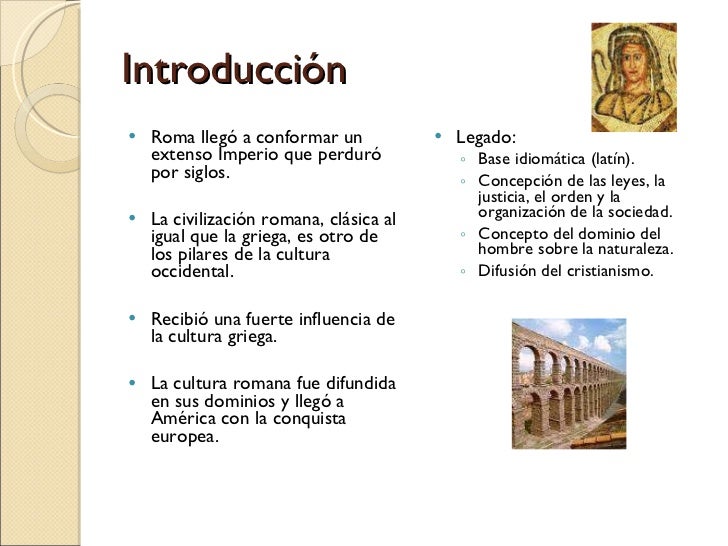 2. 2. Introducción <ul><li>Roma llegó a conformar un extenso Imperio que perduró por siglos. </li></ul><ul><li>La civilización romana, clásica al igual que la griega, es otro de los pilares de la cultura occidental. </li></ul><ul><li>Recibió una fuerte influencia de la cultura griega. </li></ul><ul><li>La cultura romana fue difundida en sus dominios y llegó a América con la conquista europea. </li></ul><ul><li>Legado: </li></ul><ul><ul><li>Base idiomática (latín). </li></ul></ul><ul><ul><li>Concepción de las leyes, la justicia, el orden y la organización de la sociedad. </li></ul></ul><ul><ul><li>Concepto del dominio del hombre sobre la naturaleza. </li></ul></ul><ul><ul><li>Difusión del cristianismo. </li></ul></ul>