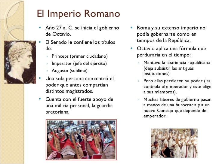 20. 20. El Imperio Romano <ul><li>Año 27 a. C. se inicia el gobierno de Octavio. </li></ul><ul><li>El Senado le confiere los títulos de: </li></ul><ul><ul><li>Princeps (primer ciudadano) </li></ul></ul><ul><ul><li>Imperator (jefe del ejército) </li></ul></ul><ul><ul><li>Augusto (sublime) </li></ul></ul><ul><li>Una sola persona concentró el poder que antes compartían distintos magistrados. </li></ul><ul><li>Cuenta con el fuerte apoyo de una milicia personal, la guardia pretoriana. </li></ul><ul><li>Roma y su extenso imperio no podía gobernarse como en tiempos de la República. </li></ul><ul><li>Octavio aplica una fórmula que perduraría en el tiempo: </li></ul><ul><ul><li>Mantuvo la apariencia republicana (deja subsistir las antiguas instituciones) </li></ul></ul><ul><ul><li>Pero ellas perdieron su poder (las controla el emperador y este elige a sus miembros). </li></ul></ul><ul><ul><li>Muchas labores de gobierno pasan a manos de una burocracia y a un nuevo Consejo que depende del emperador. </li></ul></ul>