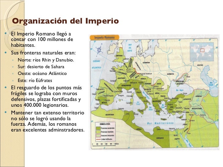 23. 23. Organización del Imperio <ul><li>El Imperio Romano llegó a contar con 100 millones de habitantes. </li></ul><ul><li>Sus fronteras naturales eran: </li></ul><ul><ul><li>Norte: ríos Rhin y Danubio. </li></ul></ul><ul><ul><li>Sur: desierto de Sahara </li></ul></ul><ul><ul><li>Oeste: océano Atlántico </li></ul></ul><ul><ul><li>Este: río Eúfrates </li></ul></ul><ul><li>El resguardo de los puntos más frágiles se lograba con muros defensivos, plazas fortificadas y unos 400.000 legionarios. </li></ul><ul><li>Mantener tan extenso territorio no sólo se logró usando la fuerza. Además, los romanos eran excelentes adminstradores. </li></ul>