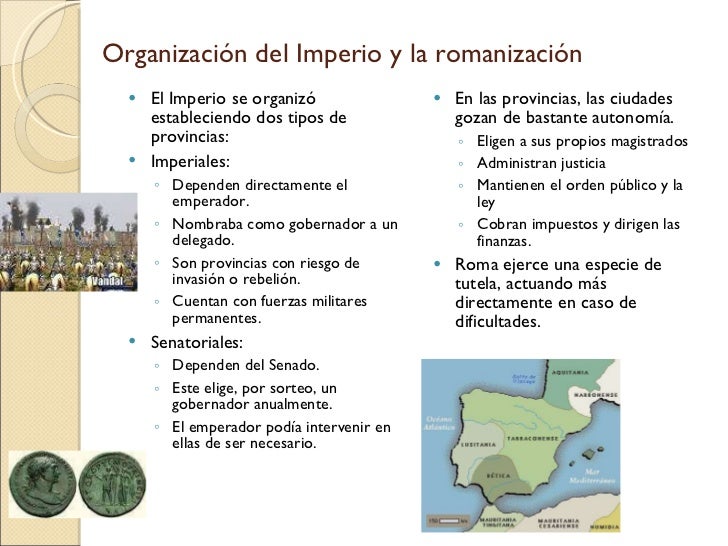 24. 24. Organización del Imperio y la romanización <ul><li>El Imperio se organizó estableciendo dos tipos de provincias: </li></ul><ul><li>Imperiales: </li></ul><ul><ul><li>Dependen directamente el emperador. </li></ul></ul><ul><ul><li>Nombraba como gobernador a un delegado. </li></ul></ul><ul><ul><li>Son provincias con riesgo de invasión o rebelión. </li></ul></ul><ul><ul><li>Cuentan con fuerzas militares permanentes. </li></ul></ul><ul><li>Senatoriales: </li></ul><ul><ul><li>Dependen del Senado. </li></ul></ul><ul><ul><li>Este elige, por sorteo, un gobernador anualmente. </li></ul></ul><ul><ul><li>El emperador podía intervenir en ellas de ser necesario. </li></ul></ul><ul><li>En las provincias, las ciudades gozan de bastante autonomía. </li></ul><ul><ul><li>Eligen a sus propios magistrados </li></ul></ul><ul><ul><li>Administran justicia </li></ul></ul><ul><ul><li>Mantienen el orden público y la ley </li></ul></ul><ul><ul><li>Cobran impuestos y dirigen las finanzas. </li></ul></ul><ul><li>Roma ejerce una especie de tutela, actuando más directamente en caso de dificultades. </li></ul>