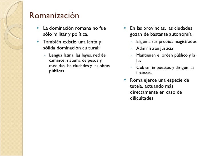 25. 25. Romanización <ul><li>La dominación romana no fue sólo militar y política. </li></ul><ul><li>También existió una lenta y sólida dominación cultural: </li></ul><ul><ul><li>Lengua latina, las leyes, red de caminos, sistema de pesos y medidas, las ciudades y las obras públicas. </li></ul></ul><ul><li>En las provincias, las ciudades gozan de bastante autonomía. </li></ul><ul><ul><li>Eligen a sus propios magistrados </li></ul></ul><ul><ul><li>Administran justicia </li></ul></ul><ul><ul><li>Mantienen el orden público y la ley </li></ul></ul><ul><ul><li>Cobran impuestos y dirigen las finanzas. </li></ul></ul><ul><li>Roma ejerce una especie de tutela, actuando más directamente en caso de dificultades. </li></ul>