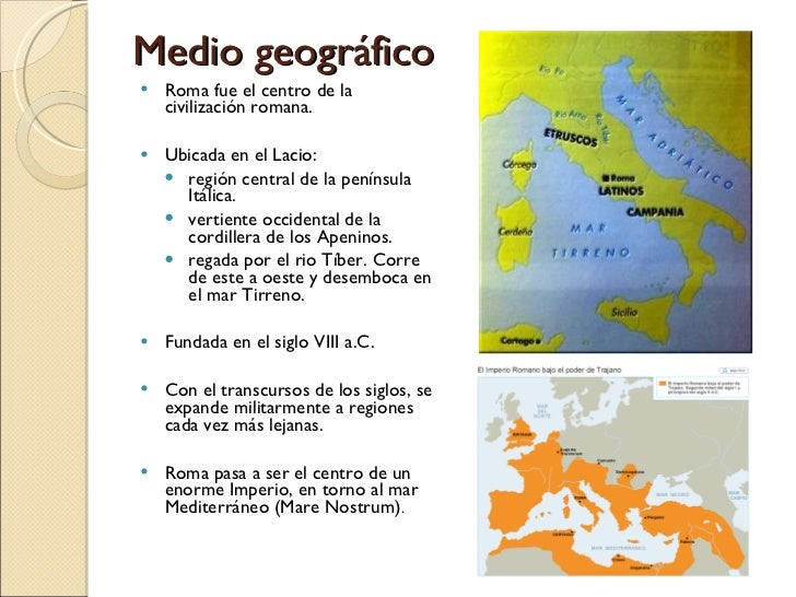 4. 4. Medio geográfico <ul><li>Río Tíber presentaba grandes crecidas. </li></ul><ul><li>Las tierras no inundadas eran aptas para la agricultura. </li></ul><ul><li>Cerca de su desembocadura se ubica la zona de las Siete Colinas. </li></ul><ul><li>Aquí confluyen pueblos del norte y sur para comerciar y obtener la codiciada sal. </li></ul><ul><li>Es una zona codiciada por su posición estratégica. Ello favorece su expansión y el dominio de la península Itálica. </li></ul><ul><li>La ubicación central de esta península en el Mediterráneo favoreció: </li></ul><ul><ul><li>Conquista y organización del Imperio Romano. </li></ul></ul><ul><ul><li>Contacto cultural entre Oriente y Occidente. </li></ul></ul>