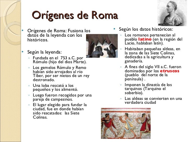 5. 5. Orígenes de Roma <ul><li>Orígenes de Roma: Fusiona los datos de la leyenda con los históricos. </li></ul><ul><li>Según la leyenda: </li></ul><ul><ul><li>Fundada en el 753 a.C. por Rómulo (hijo del dios Marte). </li></ul></ul><ul><ul><li>Los gemelos Rómulo y Remo habían sido arrojados al río Tíber, por ser nietos de un rey destronado. </li></ul></ul><ul><ul><li>Una loba rescató a los pequeños y los alimentó. </li></ul></ul><ul><ul><li>Luego fueron recogidos por una pareja de campesinos. </li></ul></ul><ul><ul><li>El lugar elegido para fundar la ciudad, fue en donde habían sido rescatados: las Siete Colinas. </li></ul></ul><ul><li>Según los datos históricos: </li></ul><ul><ul><li>Los romanos pertenecían al pueblo latino (en la región del Lacio, hablaban latín). </li></ul></ul><ul><ul><li>Habitaban pequeñas aldeas, en la zona de las Siete Colinas, dedicadas a la agricultura y ganadería. </li></ul></ul><ul><ul><li>A fines del siglo VII a.C. fueron dominados por los etruscos (pueblo del norte de la península) . </li></ul></ul><ul><ul><li>Imponen la dinastía de los tarquinos (Tarquino el soberbio). </li></ul></ul><ul><ul><li>Las aldeas se convierten en una verdadera ciudad </li></ul></ul>