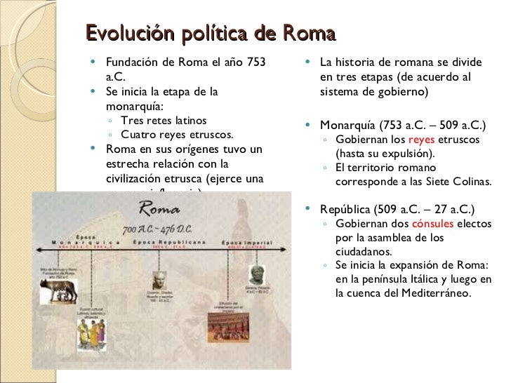 6. 6. Evolución política de Roma <ul><li>Fundación de Roma el año 753 a.C. </li></ul><ul><li>Se inicia la etapa de la monarquía: </li></ul><ul><ul><li>Tres retes latinos </li></ul></ul><ul><ul><li>Cuatro reyes etruscos. </li></ul></ul><ul><li>Roma en sus orígenes tuvo un estrecha relación con la civilización etrusca (ejerce una enorme influencia). </li></ul><ul><li>La historia de romana se divide en tres etapas (de acuerdo al sistema de gobierno) </li></ul><ul><li>Monarquía (753 a.C. – 509 a.C.) </li></ul><ul><ul><li>Gobiernan los reyes etruscos (hasta su expulsión). </li></ul></ul><ul><ul><li>El territorio romano corresponde a las Siete Colinas. </li></ul></ul><ul><li>República (509 a.C. – 27 a.C.) </li></ul><ul><ul><li>Gobiernan dos cónsules electos por la asamblea de los ciudadanos. </li></ul></ul><ul><ul><li>Se inicia la expansión de Roma: en la península Itálica y luego en la cuenca del Mediterráneo. </li></ul></ul>