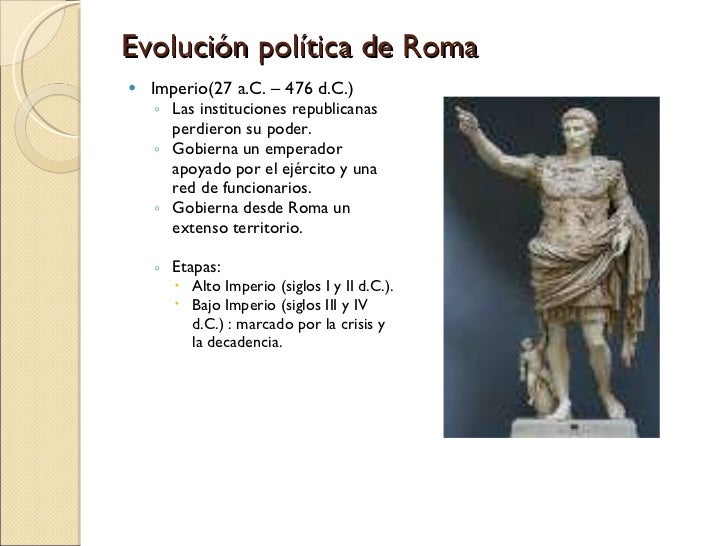 7. 7. Evolución política de Roma <ul><li>Imperio(27 a.C. – 476 d.C.) </li></ul><ul><ul><li>Las instituciones republicanas perdieron su poder. </li></ul></ul><ul><ul><li>Gobierna un emperador apoyado por el ejército y una red de funcionarios. </li></ul></ul><ul><ul><li>Gobierna desde Roma un extenso territorio. </li></ul></ul><ul><ul><li>Etapas: </li></ul></ul><ul><ul><ul><li>Alto Imperio (siglos I y II d.C.). </li></ul></ul></ul><ul><ul><ul><li>Bajo Imperio (siglos III y IV d.C.) : marcado por la crisis y la decadencia. </li></ul></ul></ul>