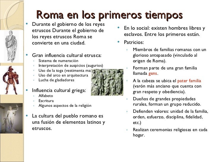 8. 8. Roma en los primeros tiempos <ul><li>Durante el gobierno de los reyes etruscos Durante el gobierno de los reyes etruscos Roma se convierte en una ciudad. </li></ul><ul><li>Gran influencia cultural etrusca: </li></ul><ul><ul><li>Sistema de numeración </li></ul></ul><ul><ul><li>Interpretación de auspicios (augurios) </li></ul></ul><ul><ul><li>Uso de la toga (vestimenta masculina) </li></ul></ul><ul><ul><li>Uso del arco en arquitectura </li></ul></ul><ul><ul><li>Lucha de gladiadores </li></ul></ul><ul><li>Influencia cultural griega: </li></ul><ul><ul><li>Alfabeto </li></ul></ul><ul><ul><li>Escritura </li></ul></ul><ul><ul><li>Algunos aspectos de la religión </li></ul></ul><ul><li>La cultura del pueblo romano es una fusión de elementos latinos y etruscos. </li></ul><ul><li>En lo social: existen hombres libres y esclavos. Entre los primeros están. </li></ul><ul><li>Patricios: </li></ul><ul><ul><li>Miembros de familias romanas con un glorioso antepasado (vinculado al origen de Roma). </li></ul></ul><ul><ul><li>Forman parte de una gran familia llamada gens . </li></ul></ul><ul><ul><li>A la cabeza se ubica el pater familia (varón más anciano que cuenta con gran respeto y obediencia). </li></ul></ul><ul><ul><li>Dueños de grandes propiedades rurales, forman un grupo reducido. </li></ul></ul><ul><ul><li>Defienden valores: unidad de la familia, orden, esfuerzo, disciplina, fidelidad, etc.) </li></ul></ul><ul><ul><li>Realizan ceremonias religiosas en cada hogar. </li></ul></ul>