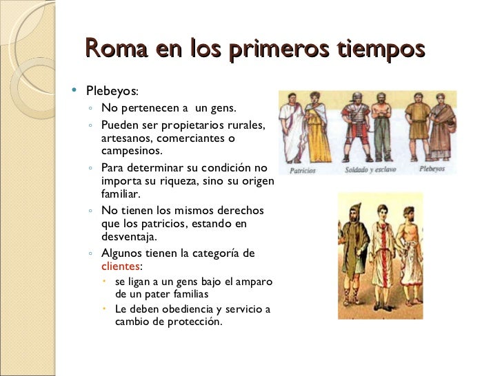 9. 9. Roma en los primeros tiempos <ul><li>Plebeyos : </li></ul><ul><ul><li>No pertenecen a un gens. </li></ul></ul><ul><ul><li>Pueden ser propietarios rurales, artesanos, comerciantes o campesinos. </li></ul></ul><ul><ul><li>Para determinar su condición no importa su riqueza, sino su origen familiar. </li></ul></ul><ul><ul><li>No tienen los mismos derechos que los patricios, estando en desventaja. </li></ul></ul><ul><ul><li>Algunos tienen la categoría de clientes : </li></ul></ul><ul><ul><ul><li>se ligan a un gens bajo el amparo de un pater familias </li></ul></ul></ul><ul><ul><ul><li>Le deben obediencia y servicio a cambio de protección. </li></ul></ul></ul>