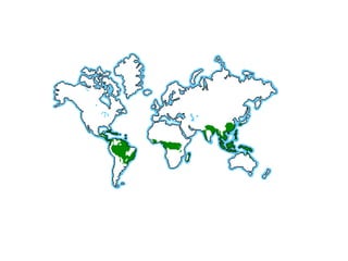 Tropical rainforests are home to a majority of the world's plant and animal species despite covering only 6% of the Earth's land. They receive a large amount of rainfall each year and support an incredibly diverse array of life. Deforestation is a major threat as rainforest lands are cleared for agriculture, logging, and other development, which contributes to climate change and loss of habitat.
