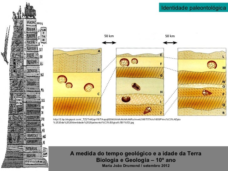 12. 12. Identidade paleontológicahttp://2.bp.blogspot.com/_TZ2TnWjqnY8/TAopq0iS84I/AAAAAAAAARo/mveU390T5TA/s1600/Princ%C3%ADpio%2520da%2520Identidade%2520paleontol%C3%B3gica%5B1%5D.jpg A medida do tempo geológico e a idade da Terra Biologia e Geologia – 10º ano Maria João Drumond / setembro 2012