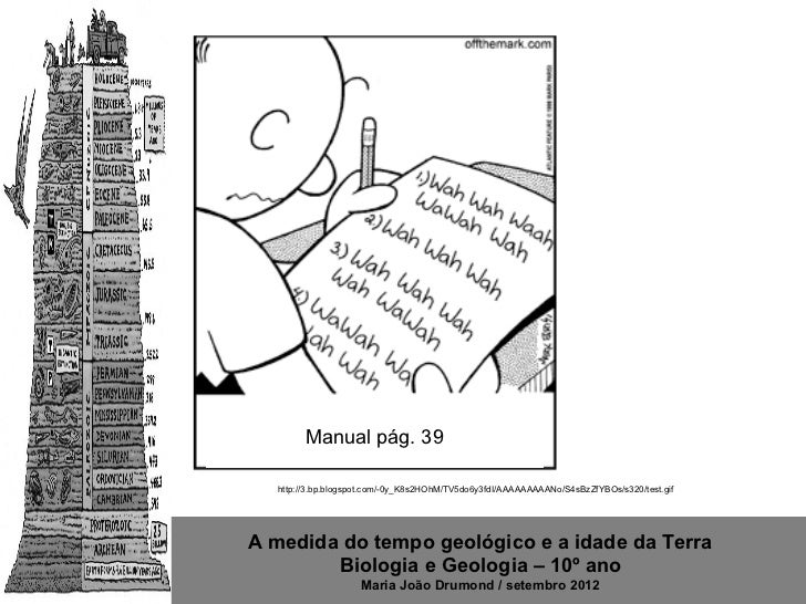 27. 27. Manual pág. 39 http://3.bp.blogspot.com/-0y_K8s2HOhM/TV5do6y3fdI/AAAAAAAAANo/S4sBzZfYBOs/s320/test.gifA medida do tempo geológico e a idade da Terra Biologia e Geologia – 10º ano Maria João Drumond / setembro 2012