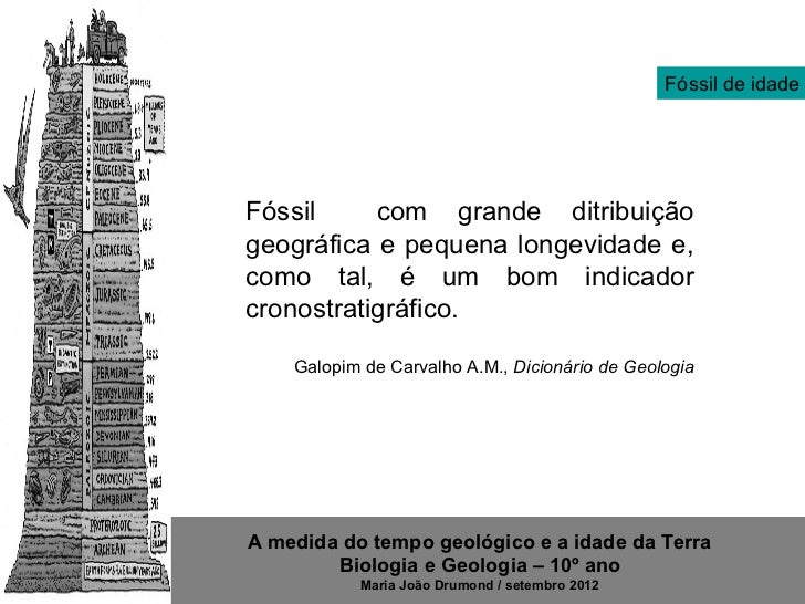 7. 7. Fóssil de idadeFóssil com grande ditribuiçãogeográfica e pequena longevidade e,como tal, é um bom indicadorcronostratigráfico. Galopim de Carvalho A.M., Dicionário de GeologiaA medida do tempo geológico e a idade da Terra Biologia e Geologia – 10º ano Maria João Drumond / setembro 2012