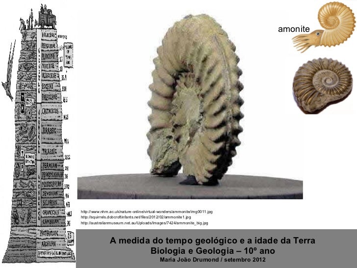 8. 8. amonitehttp://www.nhm.ac.uk/nature-online/virtual-wonders/ammonite/img0011.jpghttp://squirrels.dobcroftinfants.net/files/2012/02/ammonite1.jpghttp://australianmuseum.net.au/Uploads/Images/7424/ammonite_big.jpg A medida do tempo geológico e a idade da Terra Biologia e Geologia – 10º ano Maria João Drumond / setembro 2012